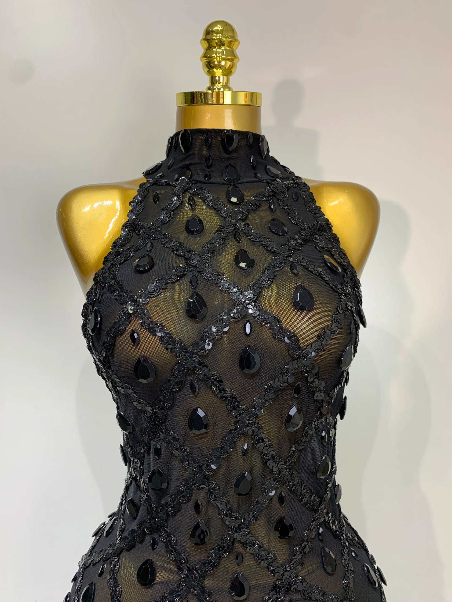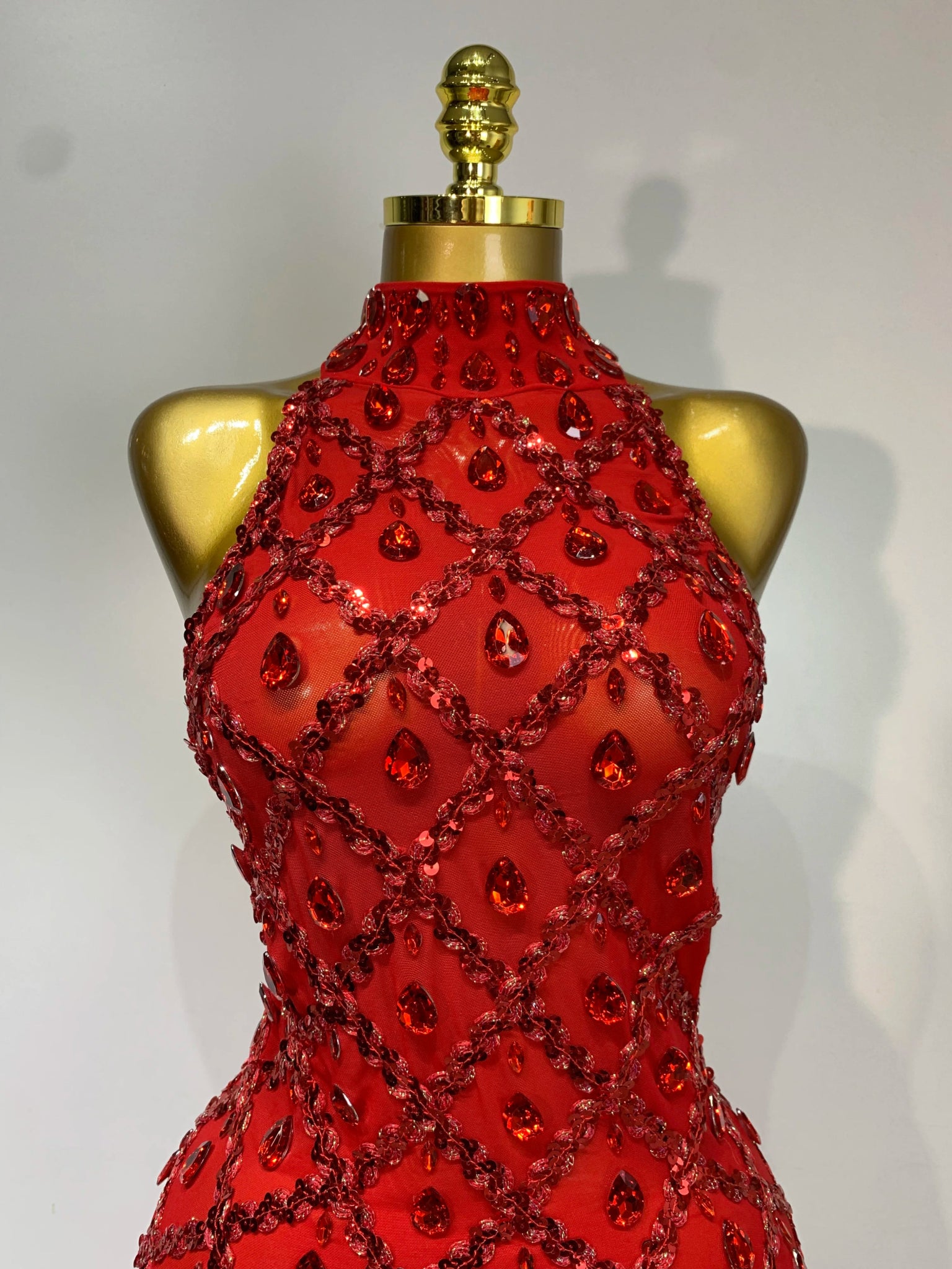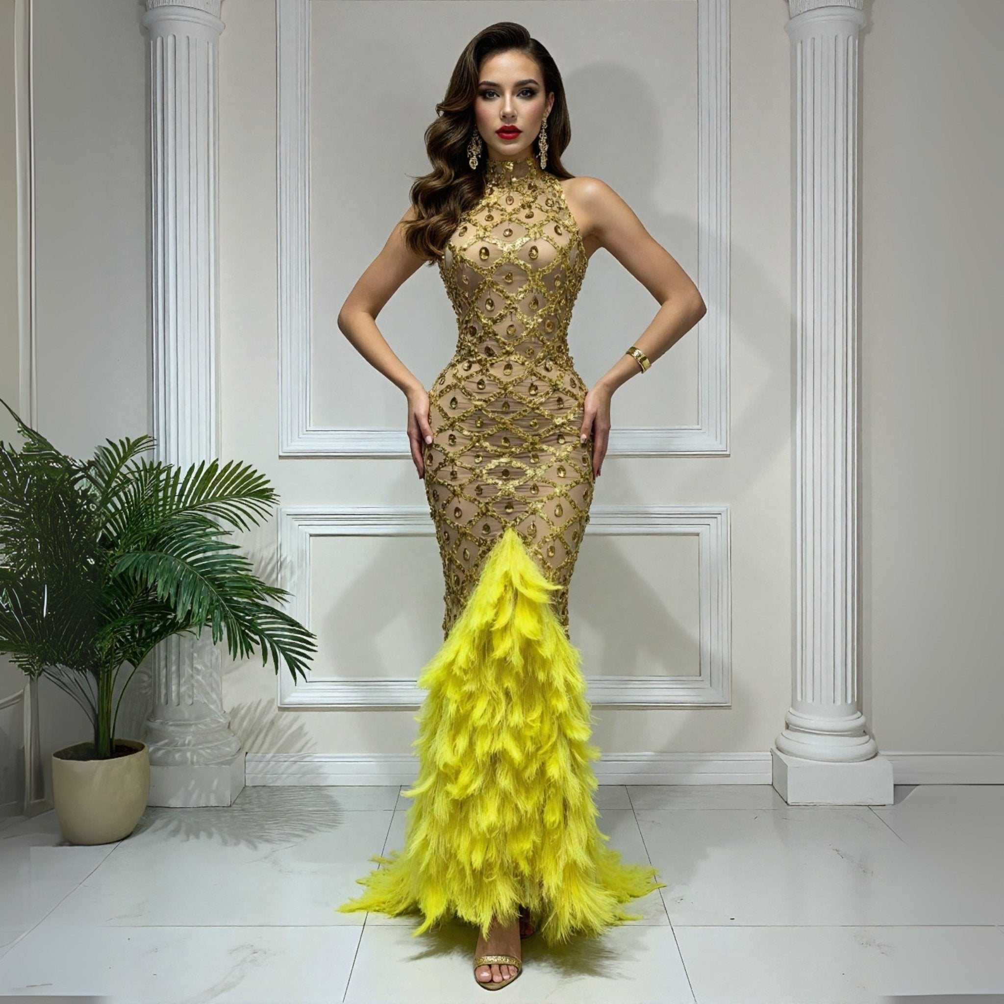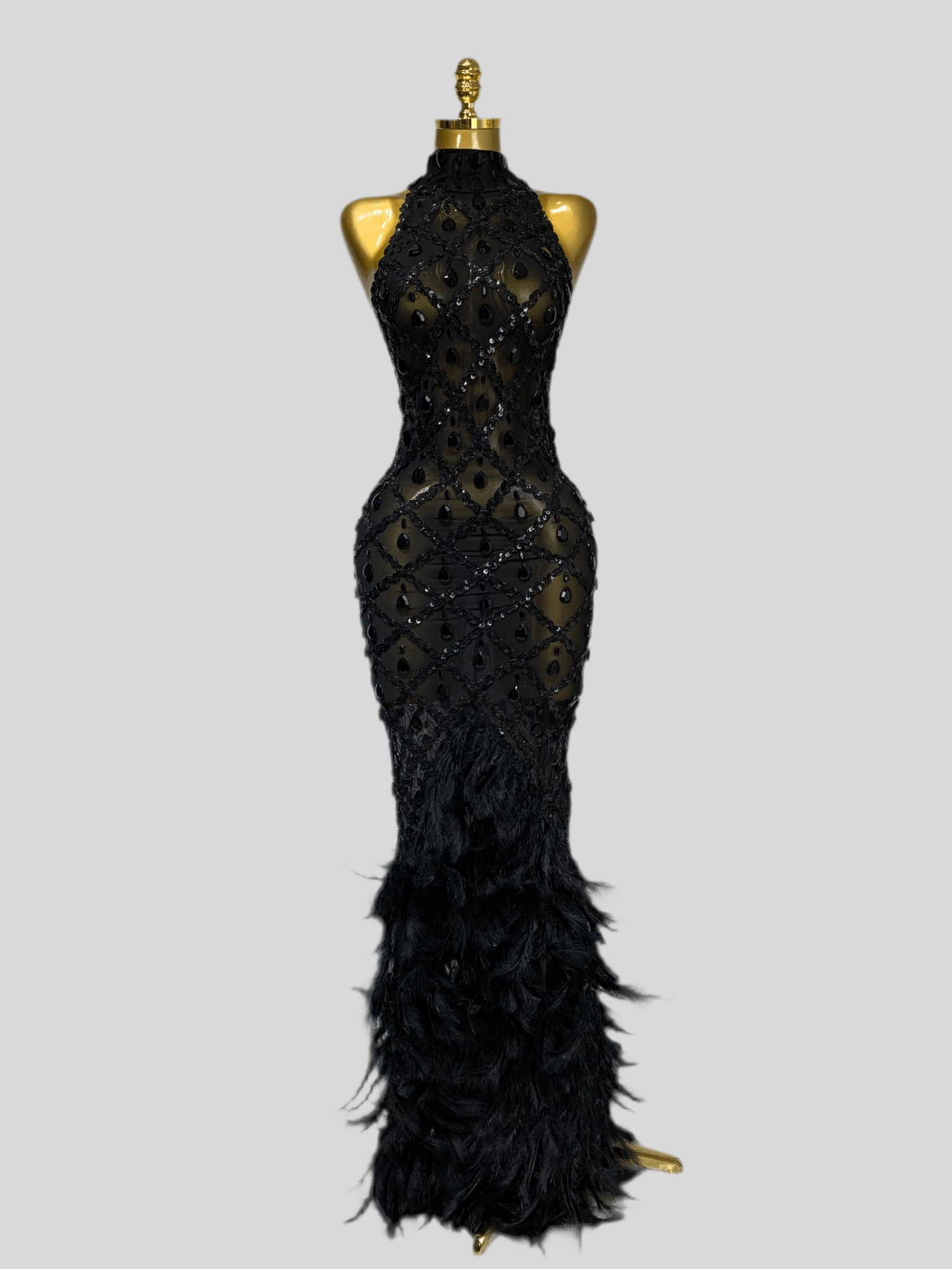 This magnificent floor-length gown is crafted to perfection in a sleek sheath silhouette. The sophisticated high-turtleneck neckline is meticulously embellished with a cascade of shimmering diamonds, creating a dazzling focal point. The true showstopper, however, is the opulent and dramatic feather detailing that adds texture, movement, and an unforgettable touch of high-fashion drama. The Aviana is more than a dress—it's a moment.