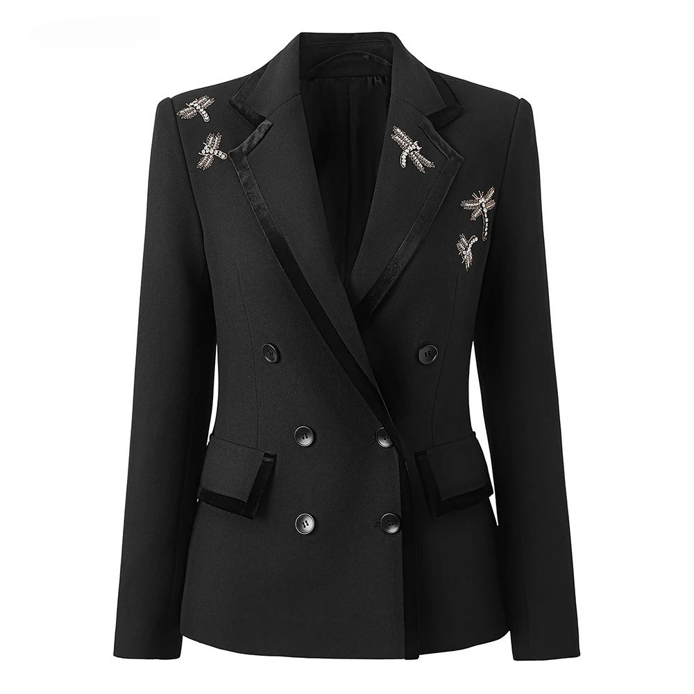 This stunning black blazer is impeccably tailored for a sharp, slim fit that defines the silhouette. The timeless double-breasted front and classic notched lapels exude an aura of authority and elegance. What sets this piece apart is the exquisite, delicate embroidery that adorns the blazer, adding a layer of unique, artistic beauty to the powerful design. The Azo is a true investment piece for a wardrobe of distinction.
