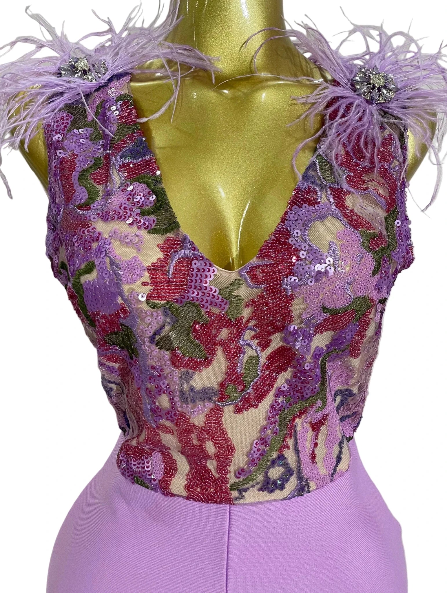 Pair with stiletto heels and a statement clutch for a high-impact party look, or add minimal jewelry to let the sparkle and feather details shine.