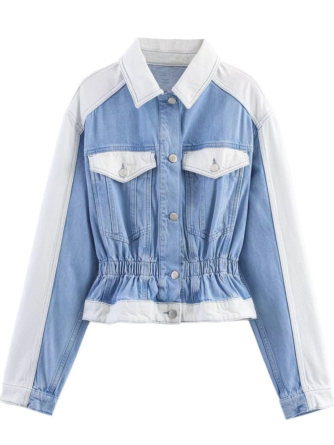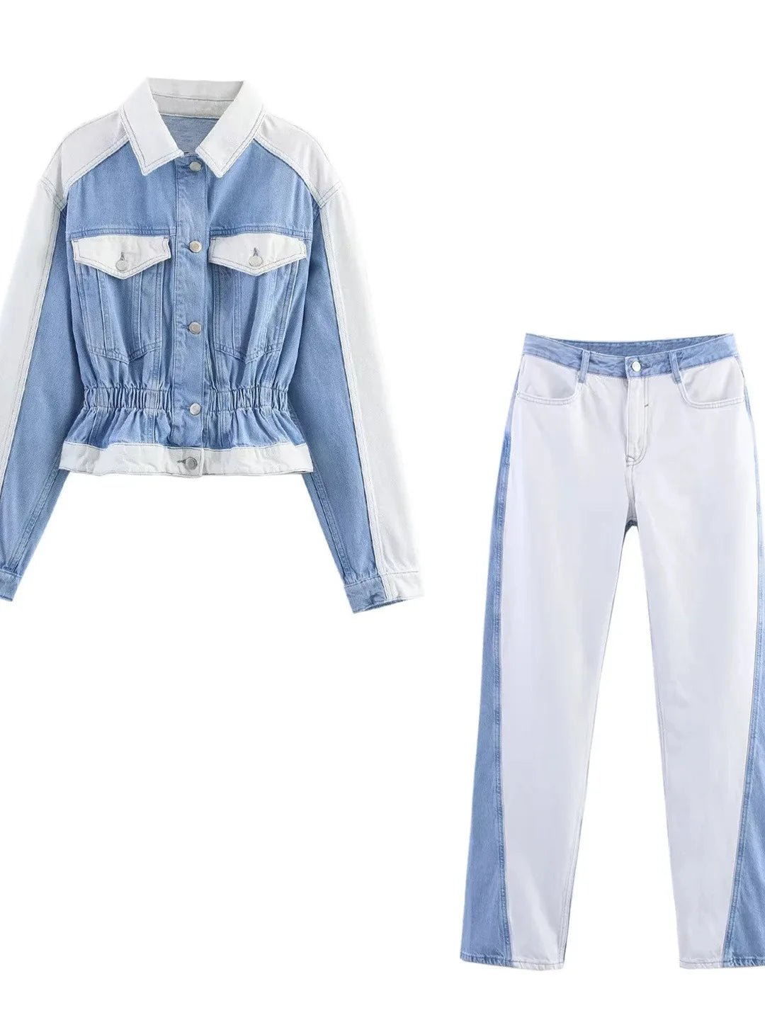 This stylish two-piece denim set features a long-sleeve flip-collar jacket with unique patchwork craftsmanship, paired with mid-waist straight-leg jeans for a flattering, balanced silhouette. Designed for versatility, the set transitions effortlessly from casual daytime wear to relaxed semi-formal outings. Crafted for adult women, it delivers both comfort and timeless denim appeal—making it a standout fall essential.
