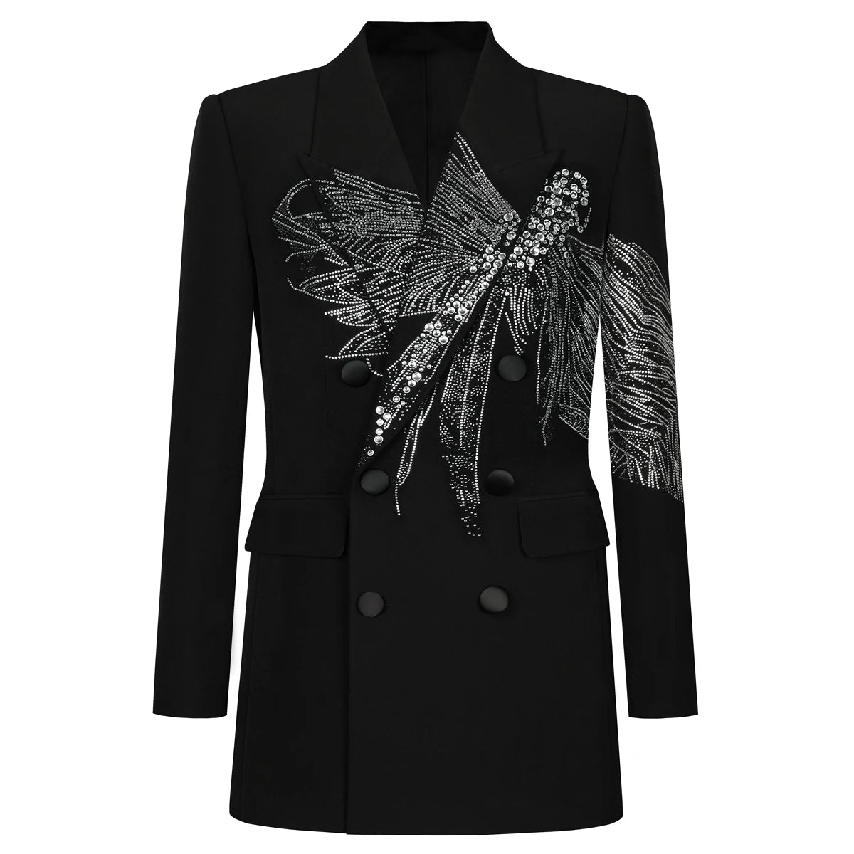 This stunning blazer is impeccably tailored in a powerful double-breasted silhouette that commands attention. The true artistry lies in the exquisite silver details, which form a subtle and sophisticated animal-inspired pattern, adding a layer of depth and high-fashion intrigue. The Elarion is more than a blazer; it's a statement of fierce individuality and refined taste, perfect for the modern-day matriarch.