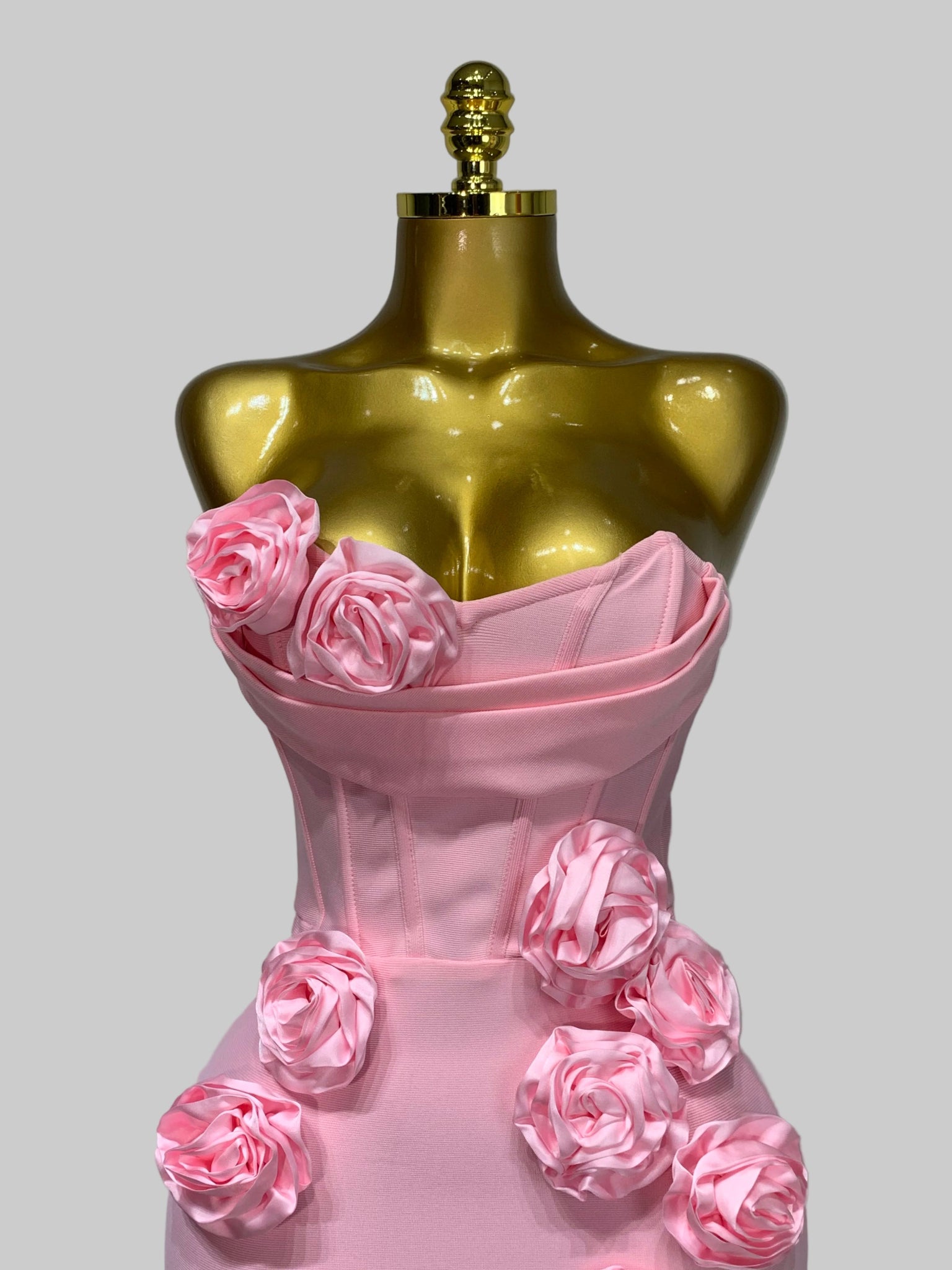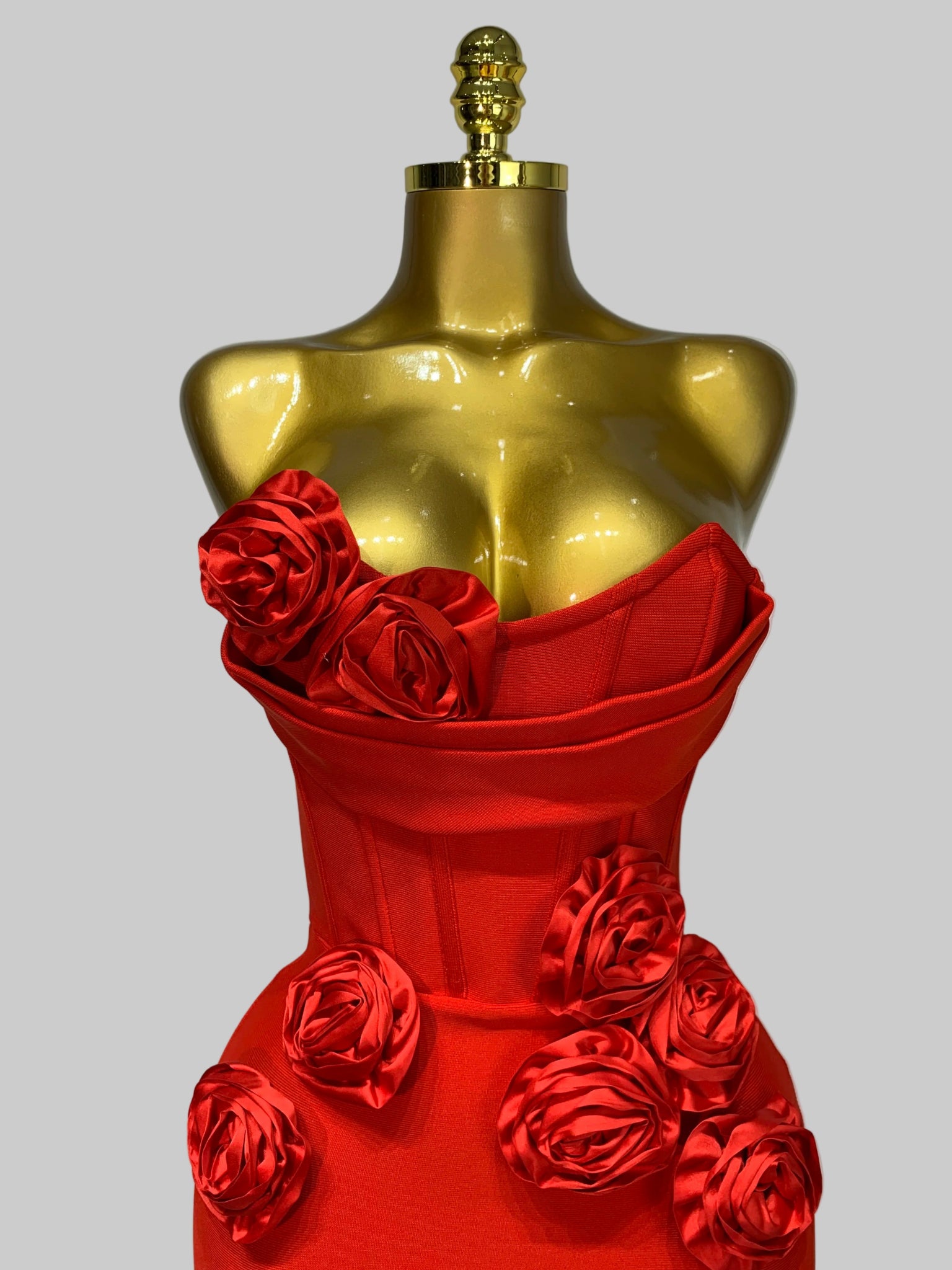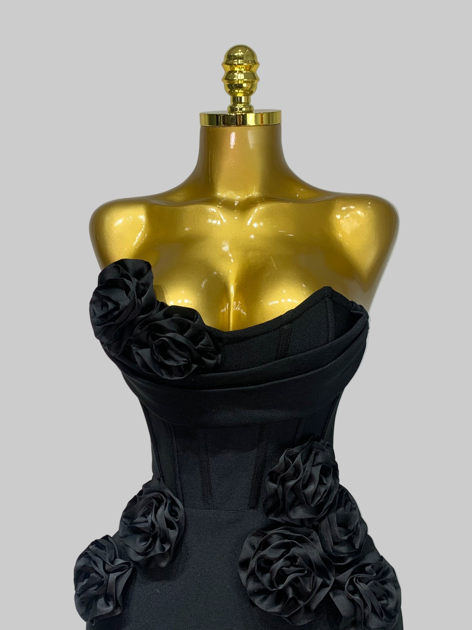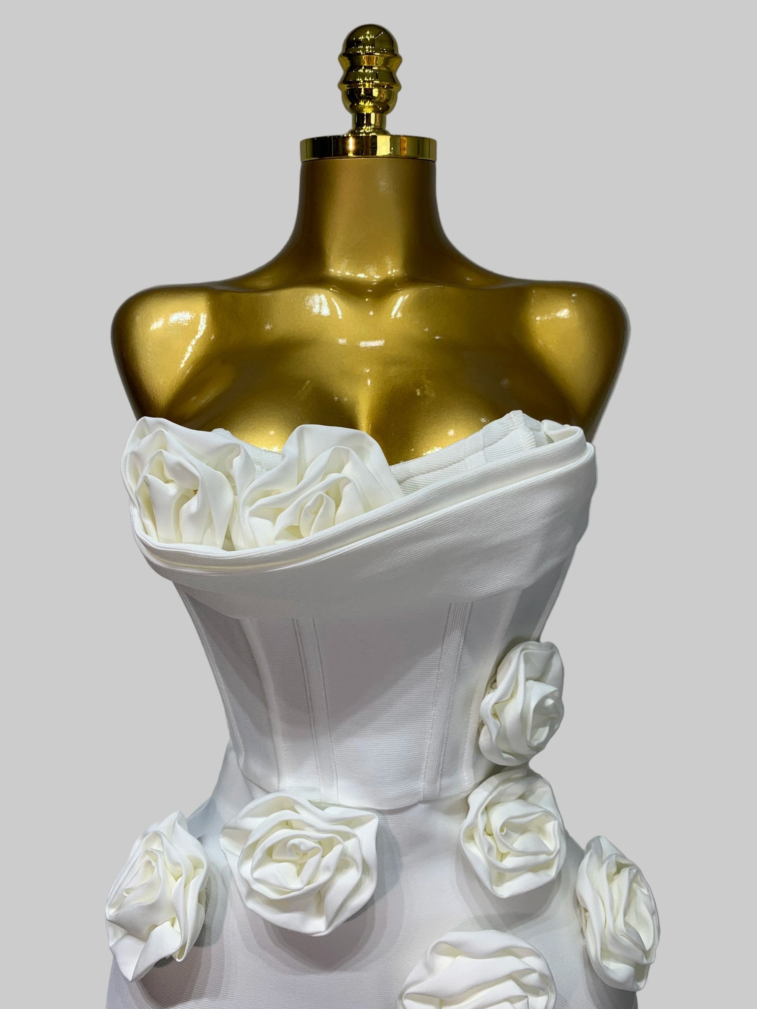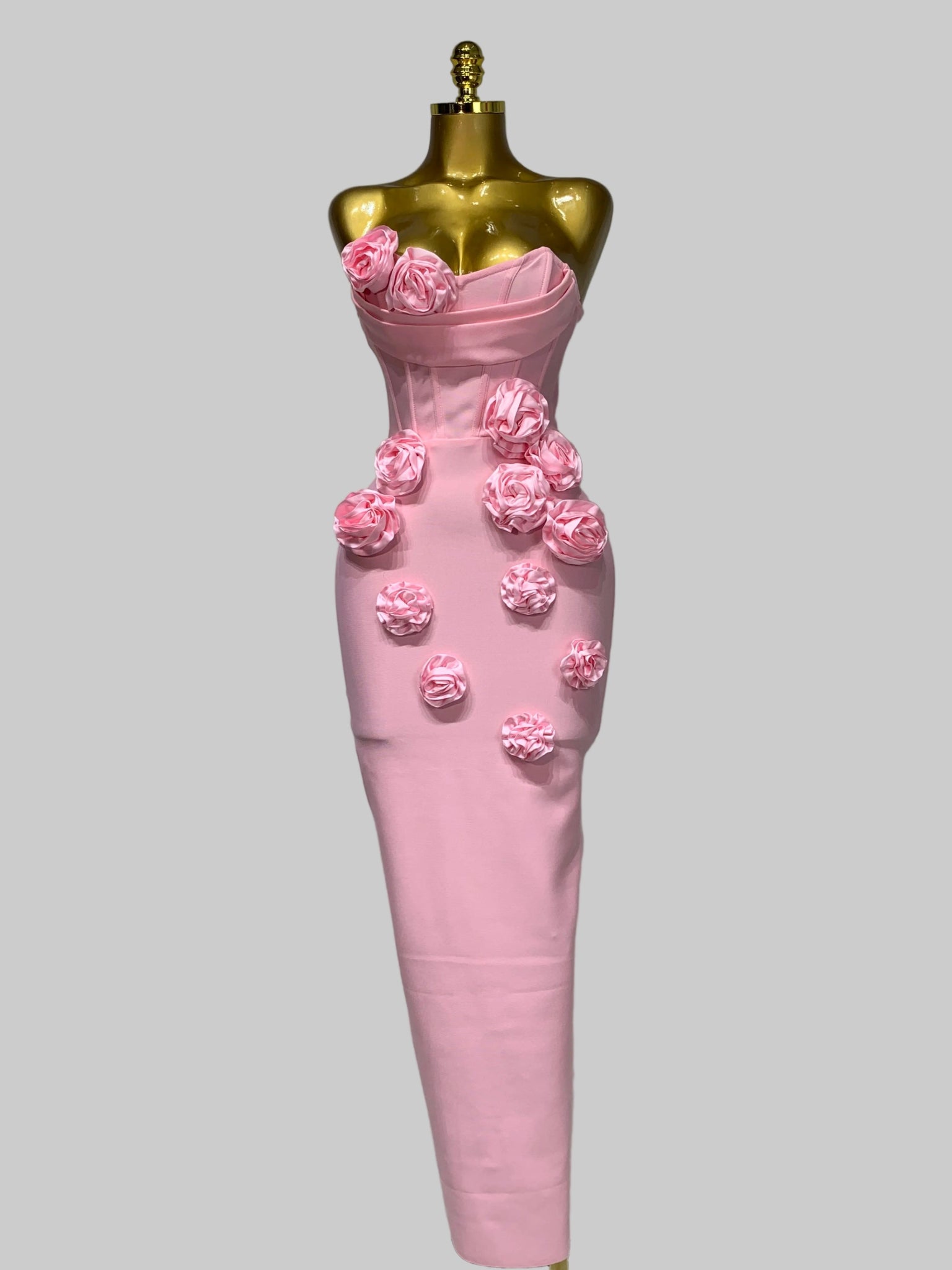 This stunning ankle-length gown is sculpted from our signature high-stretch bandage fabric, engineered to create a flawless sheath silhouette that contours and celebrates your form. The clean, timeless strapless neckline offers a perfect canvas for the dress's true artistry: delicate, three-dimensional floral accents that appear to bloom across the fabric. The Flora Gown is a wearable garden, a perfect statement for any elegant occasion.