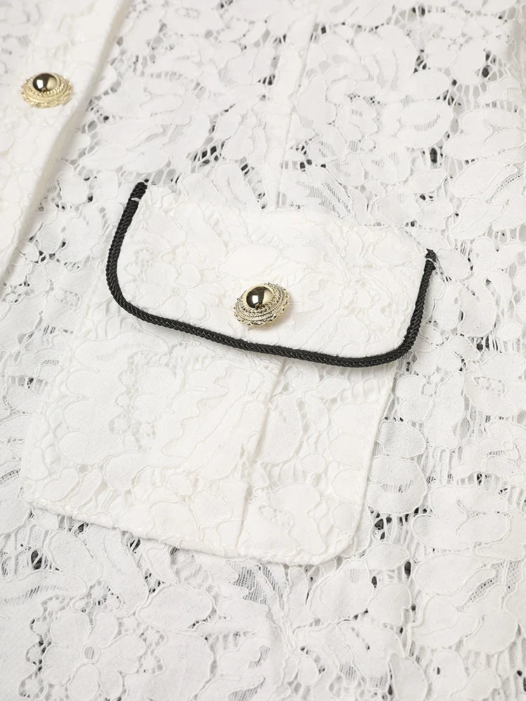 This beautiful white mini dress is crafted from a stunning, high-quality lace fabric, featuring a sophisticated "hollow out" or openwork design. The classic turn-down collar and short sleeves lend a touch of polished, preppy charm, while the flattering A-line silhouette offers a comfortable and graceful shape. The Lulitta is the epitome of chic, warm-weather elegance.