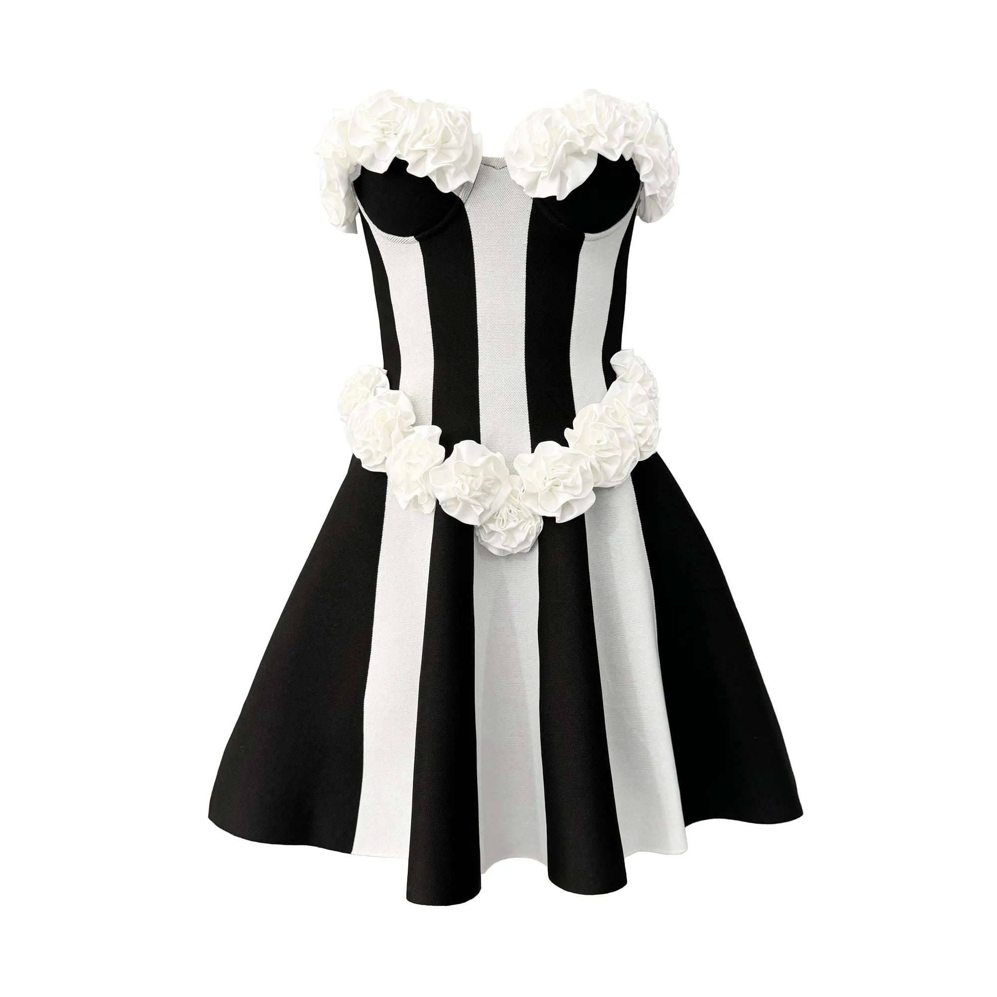 This stunning mini dress is crafted from a structured bandage fabric with chic, contrasting stripes, creating a visually captivating effect. The clean, strapless neckline and flattering A-line silhouette offer a timelessly feminine and fun shape. The true artistry lies in the exquisite white rose appliqués that are thoughtfully placed across the dress, adding a touch of three-dimensional romance and luxurious texture. The Monirosa is your perfect companion for any joyful occasion.