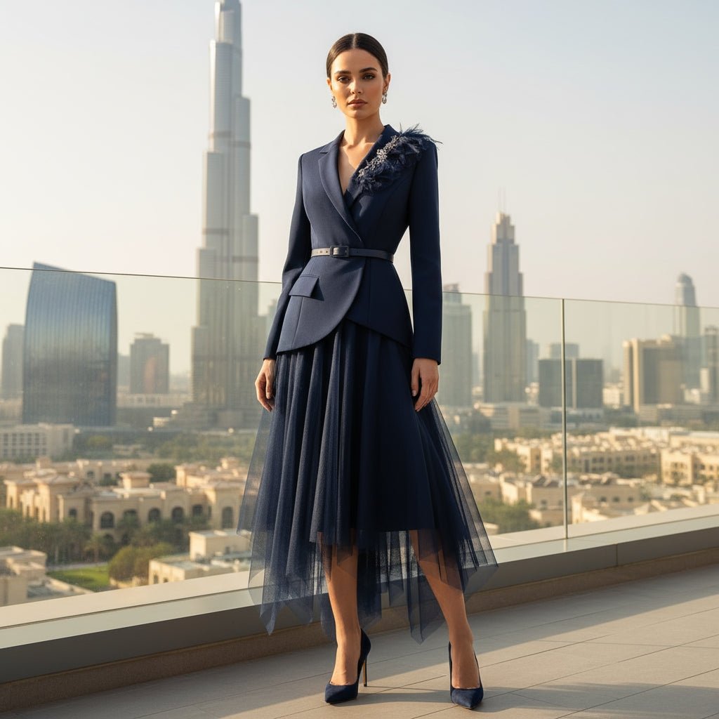 This stunning two-piece set is impeccably tailored for a sharp, commanding silhouette. The collarless blazer offers a clean, contemporary line, designed to frame the figure with minimalist precision. The coordinating knee-length pencil skirt creates a look of timeless professionalism and grace. Crafted from a structured, high-quality fabric, the Navyra set is your definitive ensemble for moments that require both power and poise.