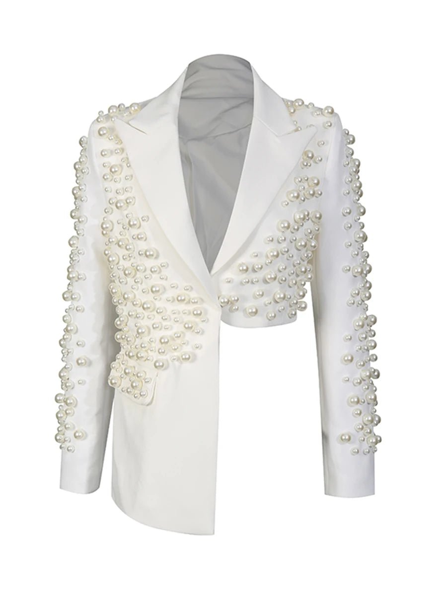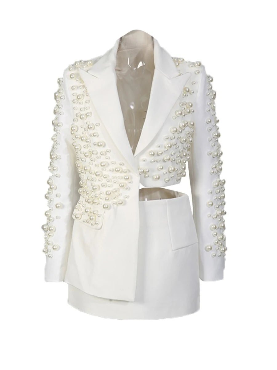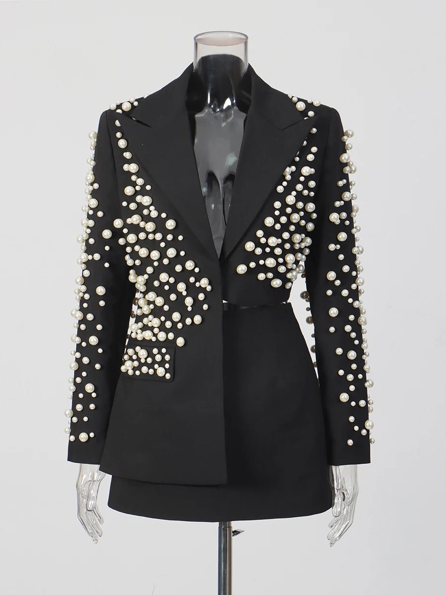 This refined two-piece skirt set features a tailored lapel long-sleeve jacket delicately accented with pearl embellishments, paired with a sleek high-waist mini skirt for a polished, feminine silhouette. Designed in a straight slim cut, the set offers structure while maintaining a graceful commuter-ready look. Crafted from woven polyester fabric, Pearla is ideal for spring and autumn styling, perfect for women who love chic basics with a touch of luxury.
