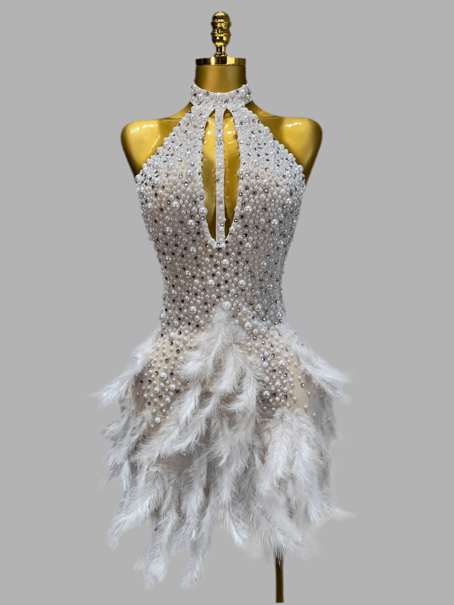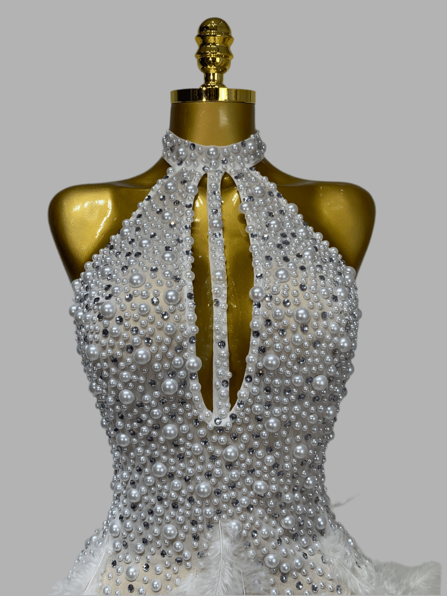 This stunning mini dress is sculpted in a flawless, figure-hugging sheath silhouette. The elegant halter neckline is meticulously embellished with a cascade of luminous pearls and sparkling diamonds, creating a breathtaking focal point. The true drama unfolds at the hemline, which is adorned with a luxurious and playful feather trim that moves with every step. The Perlamode is pure, unapologetic glamour, ready for any grand entrance.