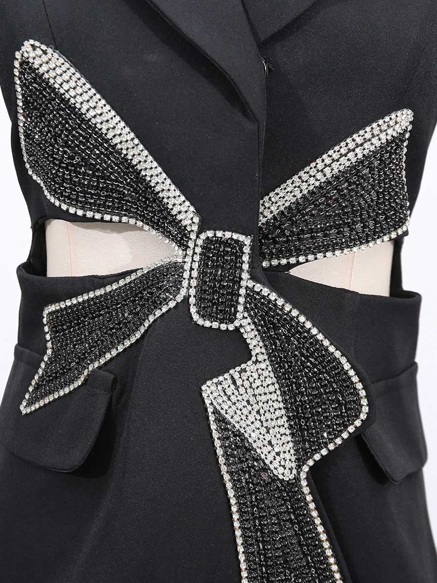 This stunning mini dress reimagines the timeless blazer with an edgy, high-fashion twist. The design features a classic lapel collar and a flattering A-line silhouette. The true artistry is revealed in the bold, hollow-out waist and the intricate sequin patchwork, which adds a dazzling and unexpected touch of brilliance. The Seyna is the perfect fusion of sophisticated tailoring and rebellious spirit, crafted for an unforgettable entrance.
