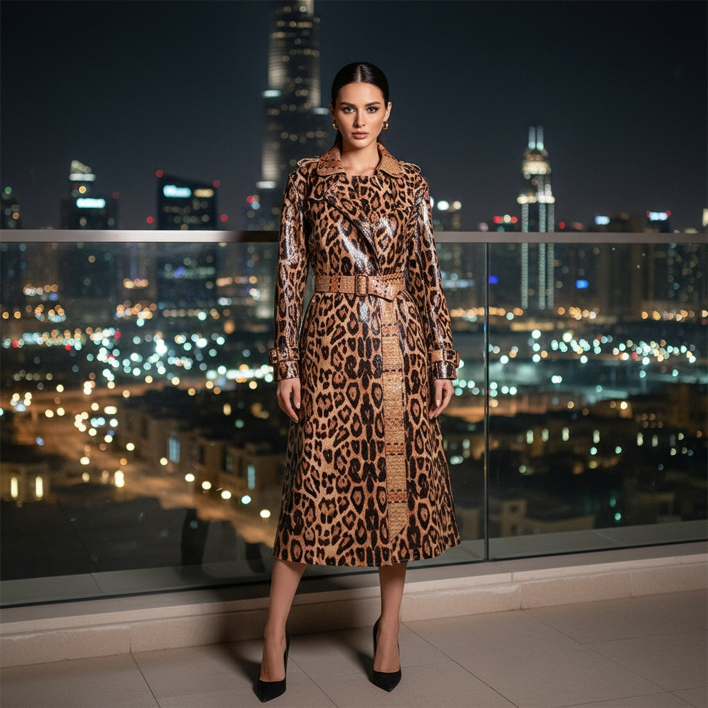 Valmira channels bold sophistication with this leopard-printed PU leather trench coat, a perfect fusion of modern edge and timeless allure.